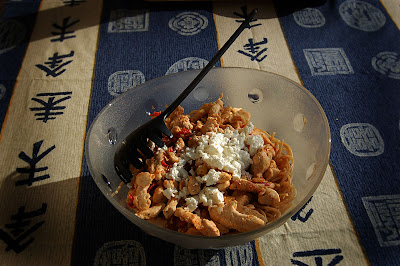 På hemvägen blev det en runda till butiken och sen hem och fixa middag. Jag kokade spaggar och sen stekte jag kyckling i färskhackad vitlök och färks chili direkt från föräldranas växthus. Lite getost på toppen och det var en riktigt prima middag. Vi åt ute på terassen i sommarvärmen och hade det riktigt skönt. Njöt till fullo av lugnet och sällskapet :)