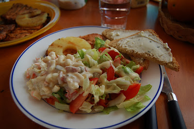 Carola fixade en god middag bestående av grillat kött, ananas och sallad. Jätte gott! Lite senare kom Marlene och lilla Elin också ner och hälsade på. Barnen plaskade på med vatten i kannor och kastruller. Det blev ganska blött, men trappan blev iaf ren om den varit smutsig innan :) Sen blev det kaffe då alla var samlade och kvällen tillbringades på terassen med många funderingar. Härligt!!!